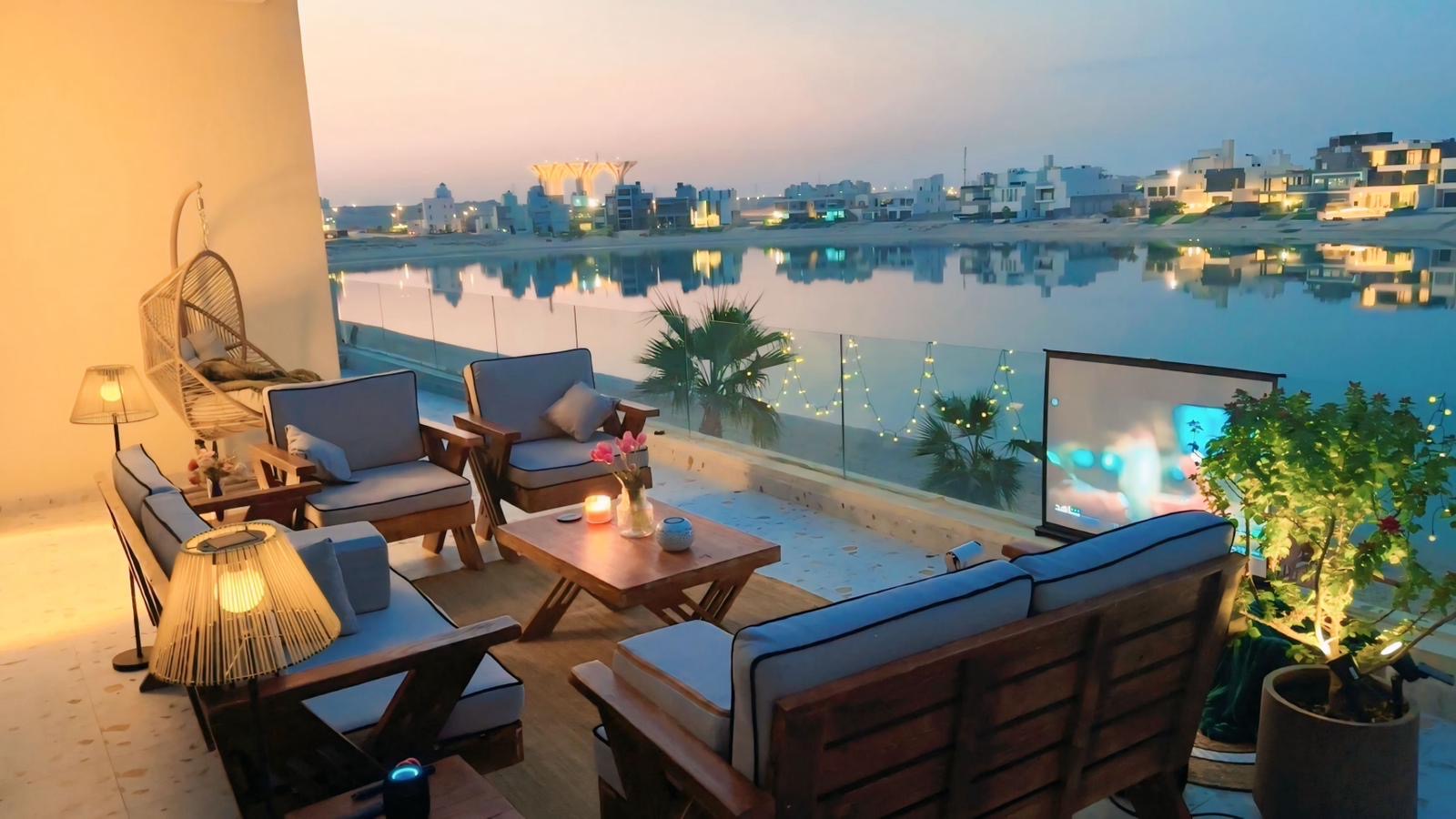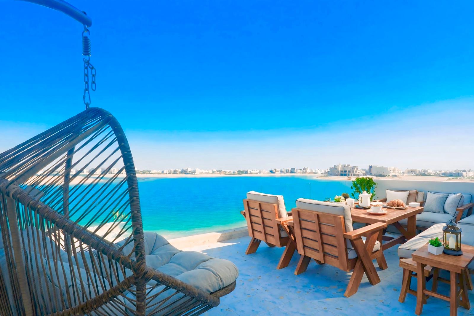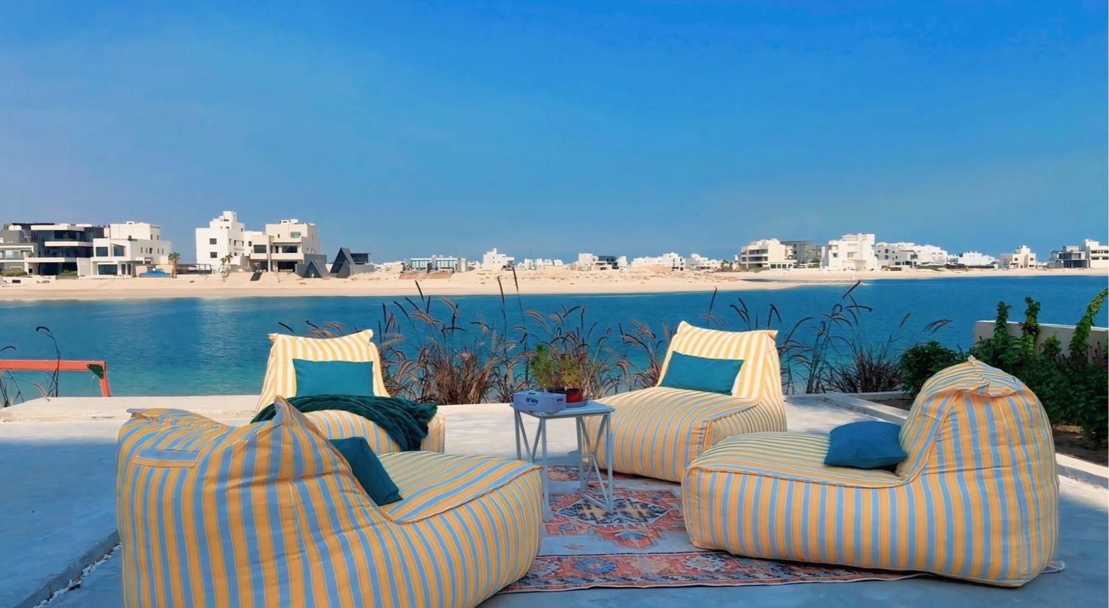 A chalet with a direct beach view Phase 5, Road 290 *Components* 1) Ground Floor: - Master bedroom. - Living room with an 85-inch TV. - Minibar, coffee and tea maker. - Guest bathroom and sinks. - Open dining room overlooking the lounge and pool. - Kitchen with gas stove, microwave, electric oven, and cooking utensils. 2) Exterior View: • Two swimming pools: for adults, 5.60 x 7 meters with a waterfall at a depth of 144 cm, and for children, 3.27 x 2.56 meters, 60 cm deep. Heater available. - Two outdoor seating areas overlooking the sea. - Sun loungers. - Parking spaces. - Balconies overlooking the sea and the street. 3) First floor • Two master bedrooms with double beds, overlooking the balcony and the beach directly. • Five master bedrooms, each with two single beds. External features: * Parking